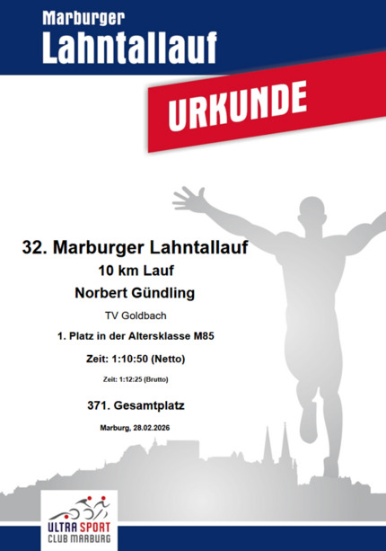 So nutzte auch unser Norbert Gündling zum Februar-Ausklang am 28.02.2026 den Start über die 10 km Strecke beim 32. Marburger Lahntallauf.
